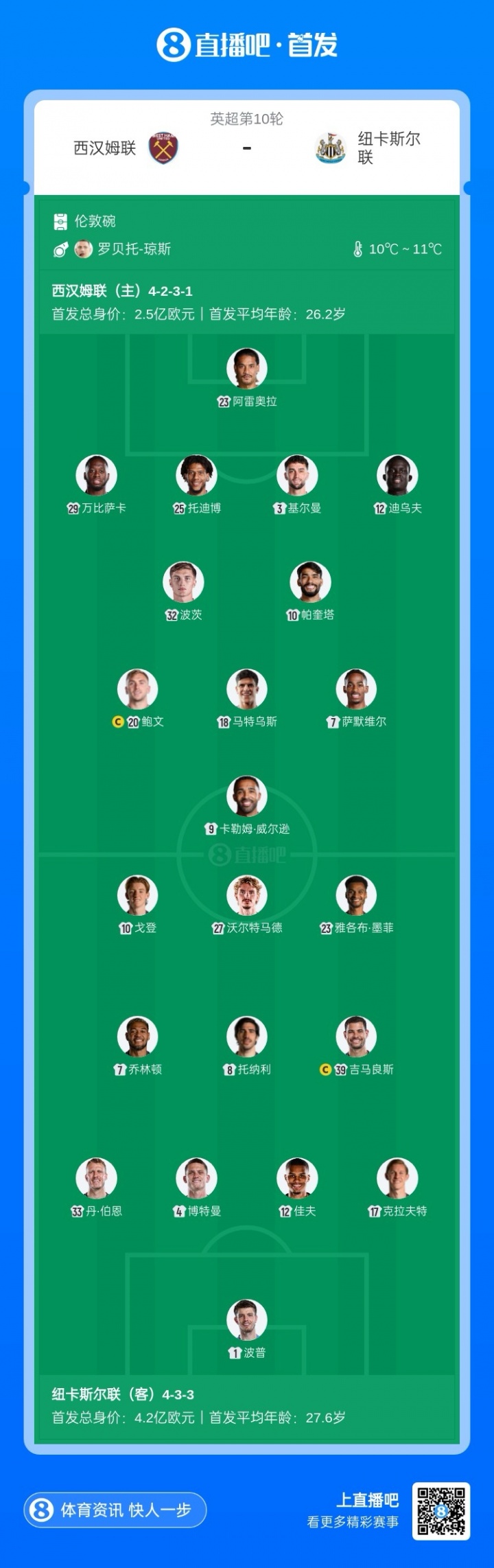 11月02日讯 北京时间22:00,英超第10轮,西汉姆联vs纽卡,赛前双方首发公布!【本场比赛西汉姆联方面,威尔逊出任单箭头,波茨、帕奎塔搭档中场,纽卡方面沃尔特马德出任中锋,吉马良斯,托纳利坐镇中场】