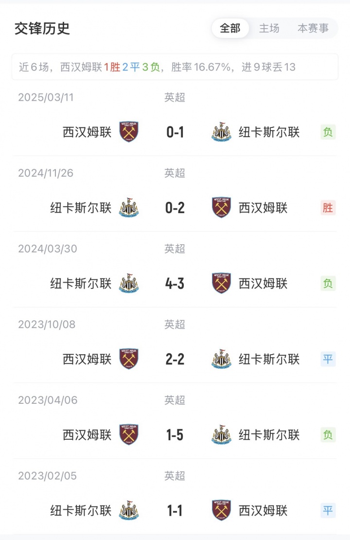 目前英超积分榜上,西汉姆联1胜1平7负,位列第19;纽卡斯尔联3胜3平3负,位列第13