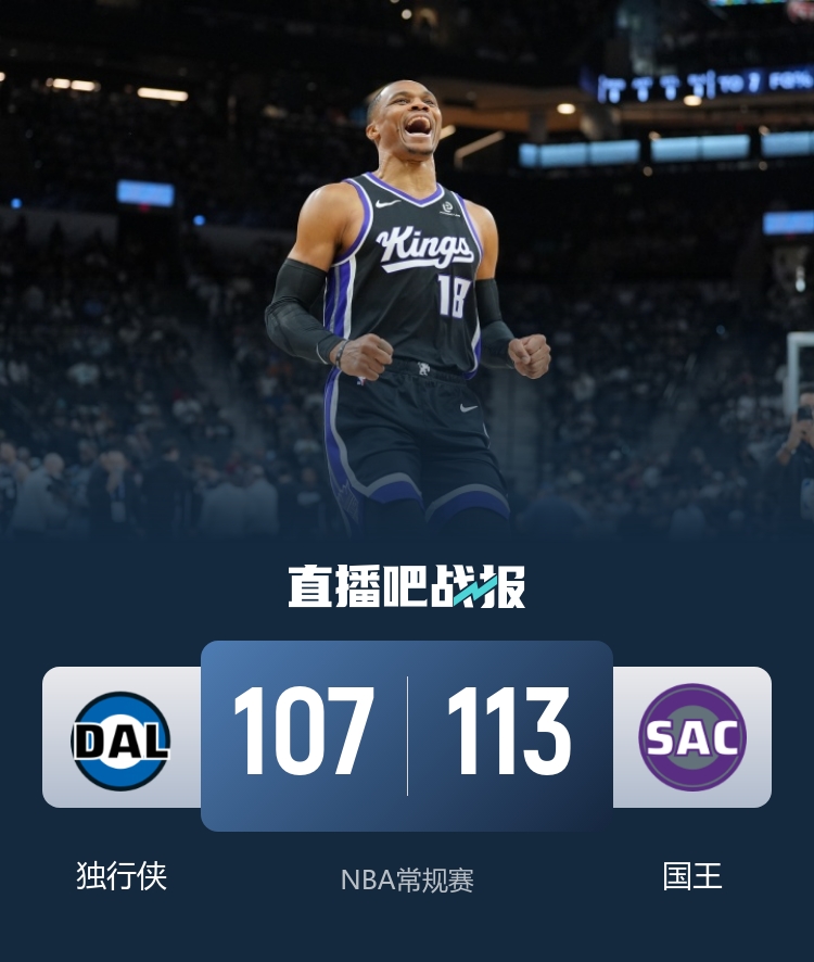 比赛开始,威少连送助攻,国王攻防两端压制对手轰出22-3的进攻狂潮确立优势,此后独行侠展开反击,华盛顿暴扣带队完成11-0的攻击波迫近比分,蒙克传射建功帮助国王稳住局势,威少三分再中,半场战罢国王59-44领先独行侠。易边再战,弗拉格强势反弹半节独得15分,威少3记三分稳住局势,国王再度轰出17-2的攻击波保持领先,末节两队围绕10分左右的分差展开激烈争夺,独行侠奋力反扑缩小分差,华盛顿关键时刻进攻犯规。最终,国王113-107力克独行侠,主场过关。