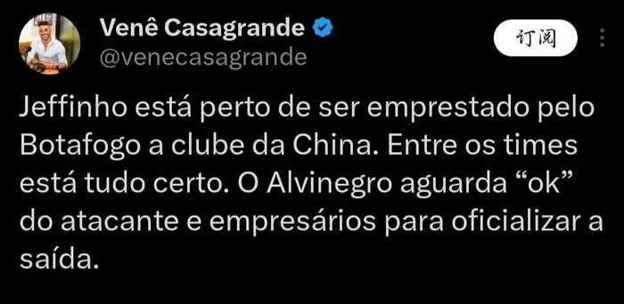 2026年1月6日,拥有百万粉丝的外媒记者Vene Casagrande报道,博塔弗戈现役球员、前里昂巅峰价值1000万欧元的前锋热菲尼奥将租借加盟1家中国俱乐部。据了解,这家中国俱乐部已经和博塔弗戈谈妥,俱乐部之间已没有其他问题,现在就差球员点头了。现阶段博塔弗戈正在等待这名前锋和经纪人的同意,然后正式确定他的离队。从目前的实际情况来看,热菲尼奥登陆中超问题不大。